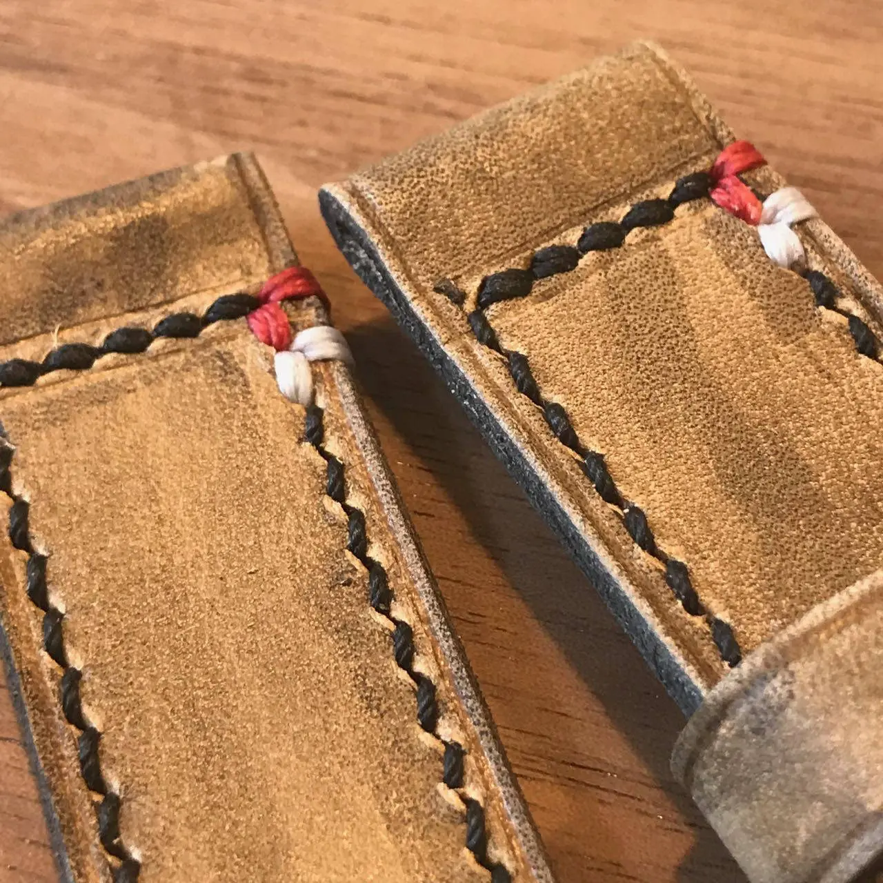 Dureable saddle leather that will develop an unique patina and will get darker during use. Darkened edges. Buckle as required. Extra "flag accent" available upon request.