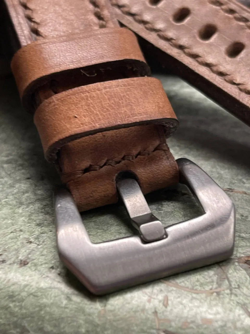 Waxed vegetable tanned saddle leather, aged and with a starters patina to emphasise its vintage style.